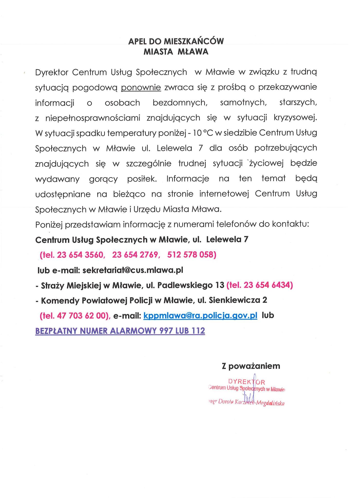 • Centrum Usług Społecznych w Mławie – tel. 23 654 3560, 23 654 2769, 512 578 058