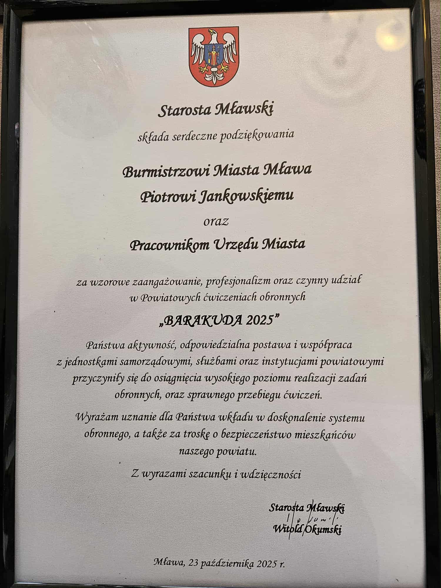 W ćwiczeniach uczestniczył Zastępca Burmistrza Miasta Mława Mariusz Szczechowicz, który reprezentował samorząd miasta. Na jego ręce zostały przekazane podziękowania od Starosty Mławskiego za wzorowe zaangażowanie, profesjonalizm oraz czynny udział w Powiatowych Ćwiczeniach Obronnych „BARAKUDA – 2025”.