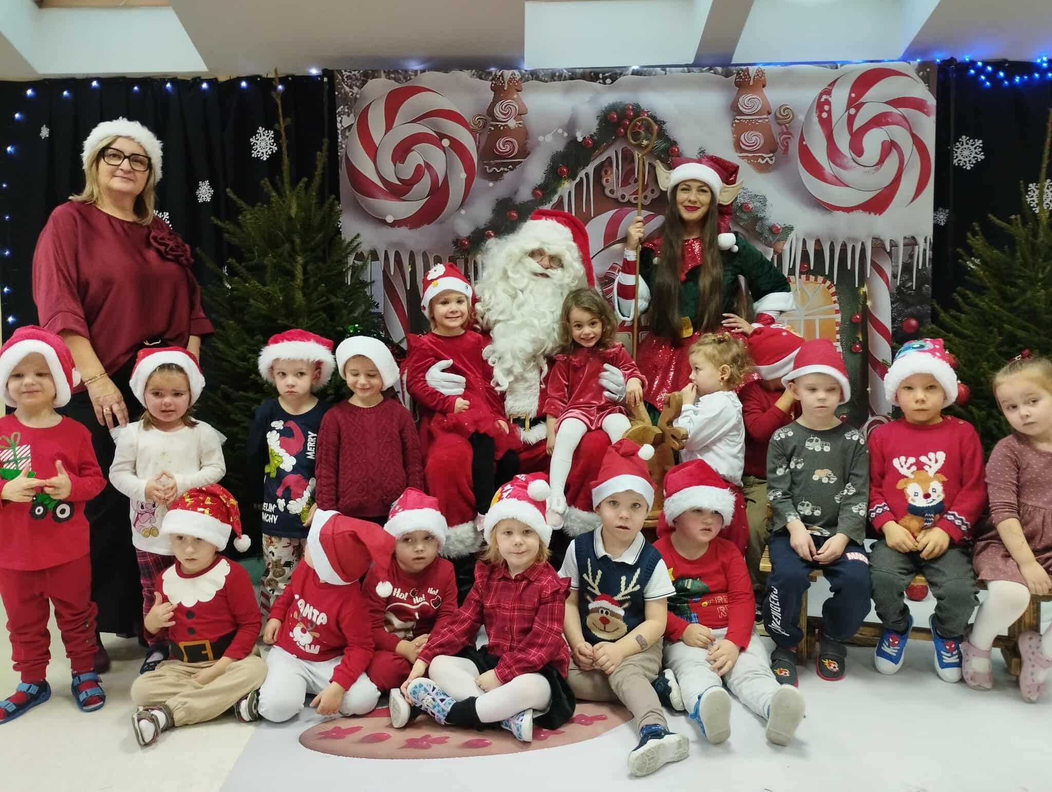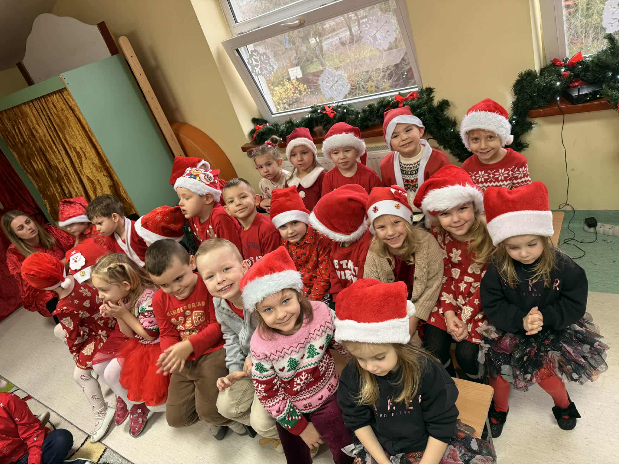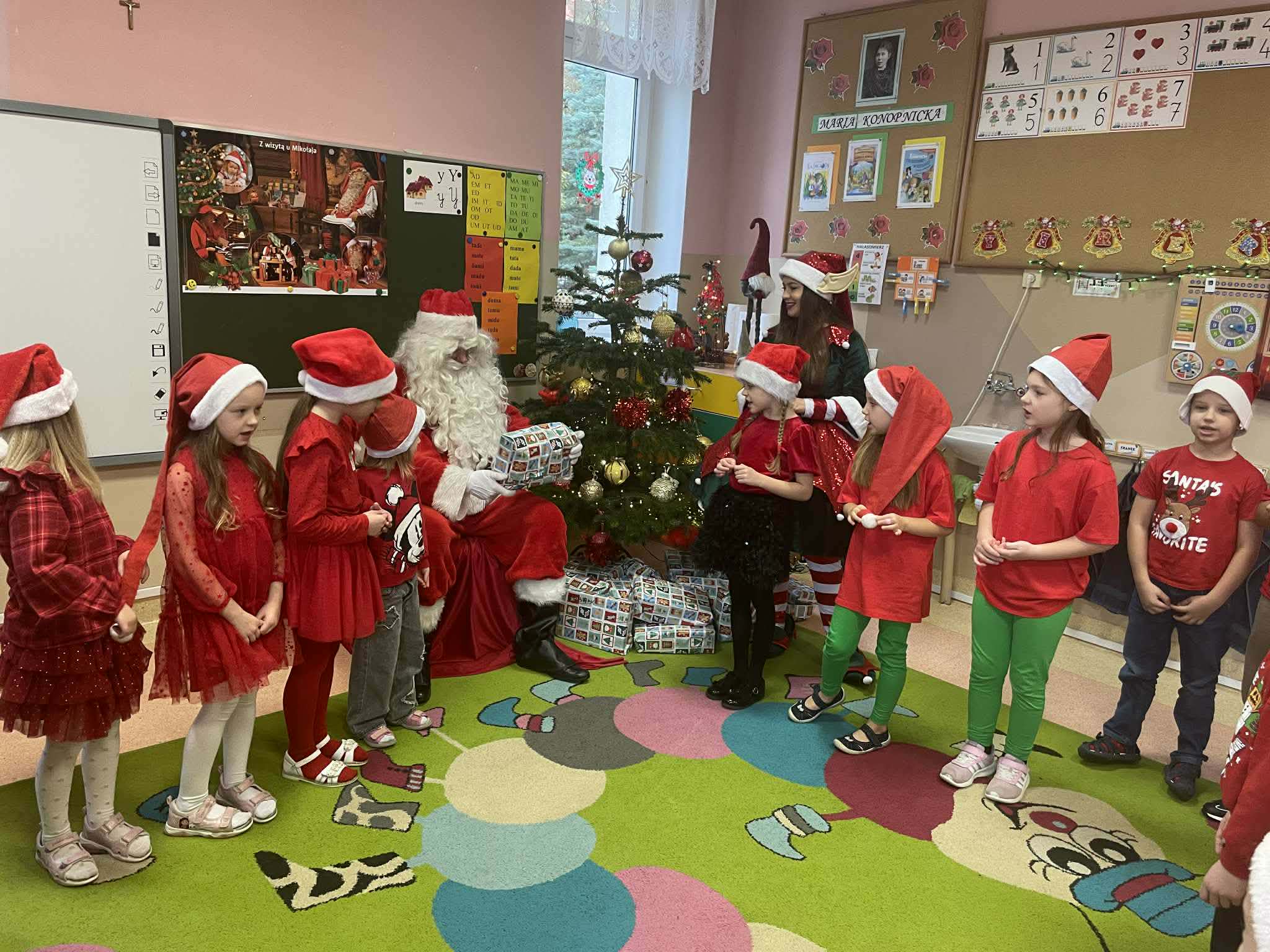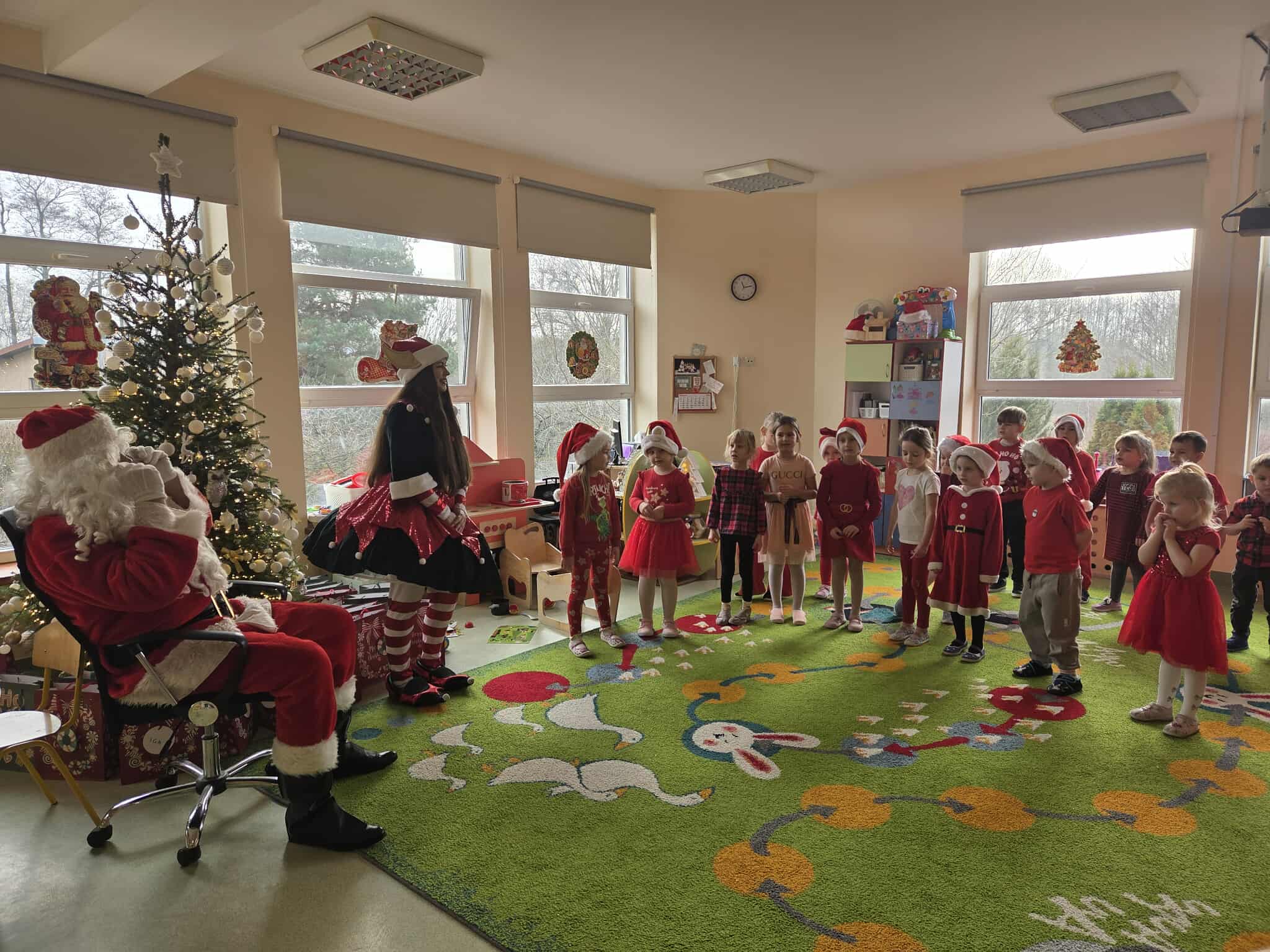 Już od rana dzieci z niecierpliwością wyczekiwały jego przybycia, wsłuchując się w dźwięk dzwoneczków i wypatrując charakterystycznej czerwonej czapki. Mikołaj odwiedził wszystkie grupy, wchodząc do sal z wielkim uśmiechem oraz workiem pełnym upominków. Każde dziecko otrzymało prezent, a Mikołaj znalazł chwilę, by zamienić z przedszkolakami kilka słów i wysłuchać ich świątecznych marzeń.