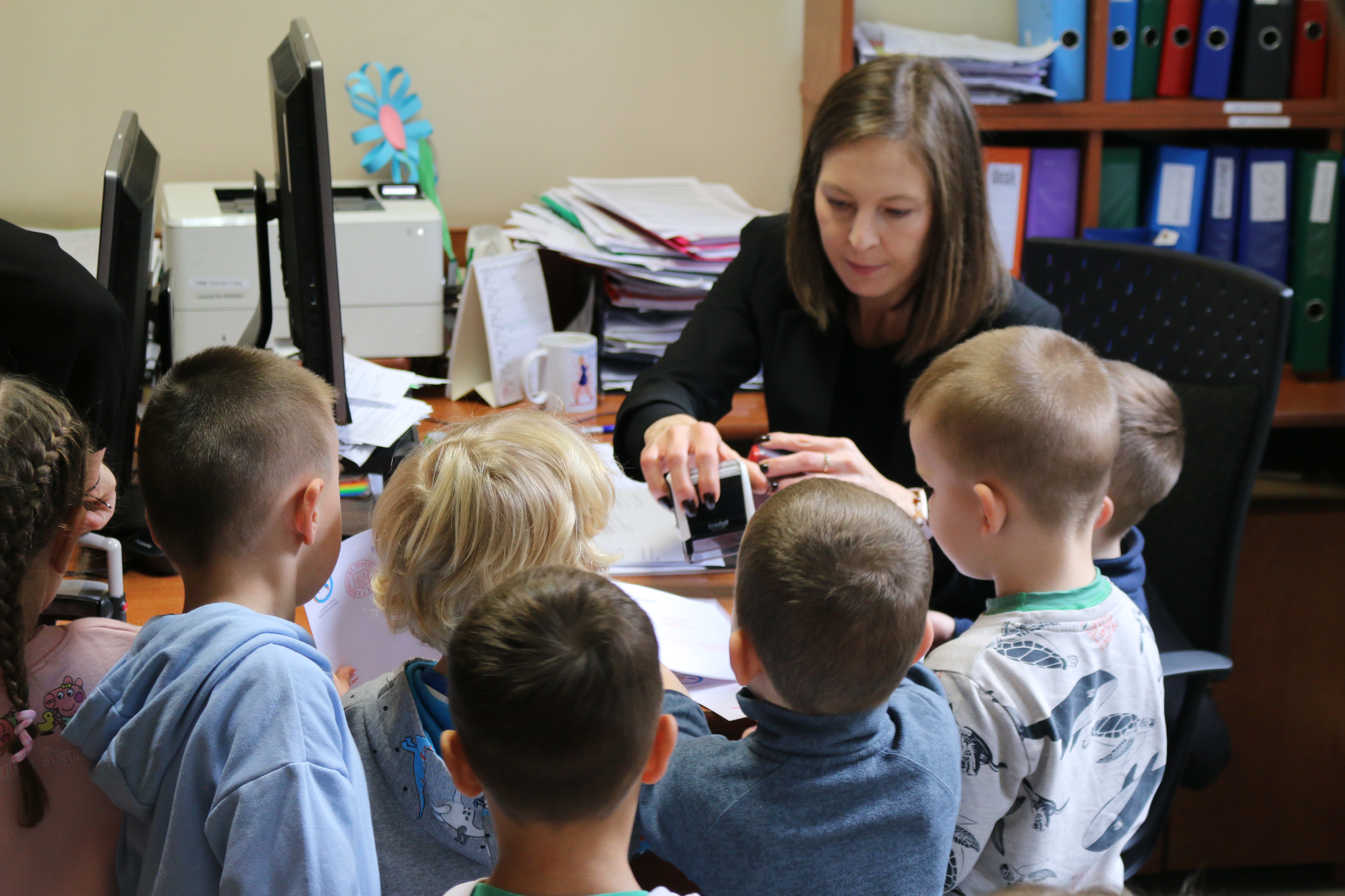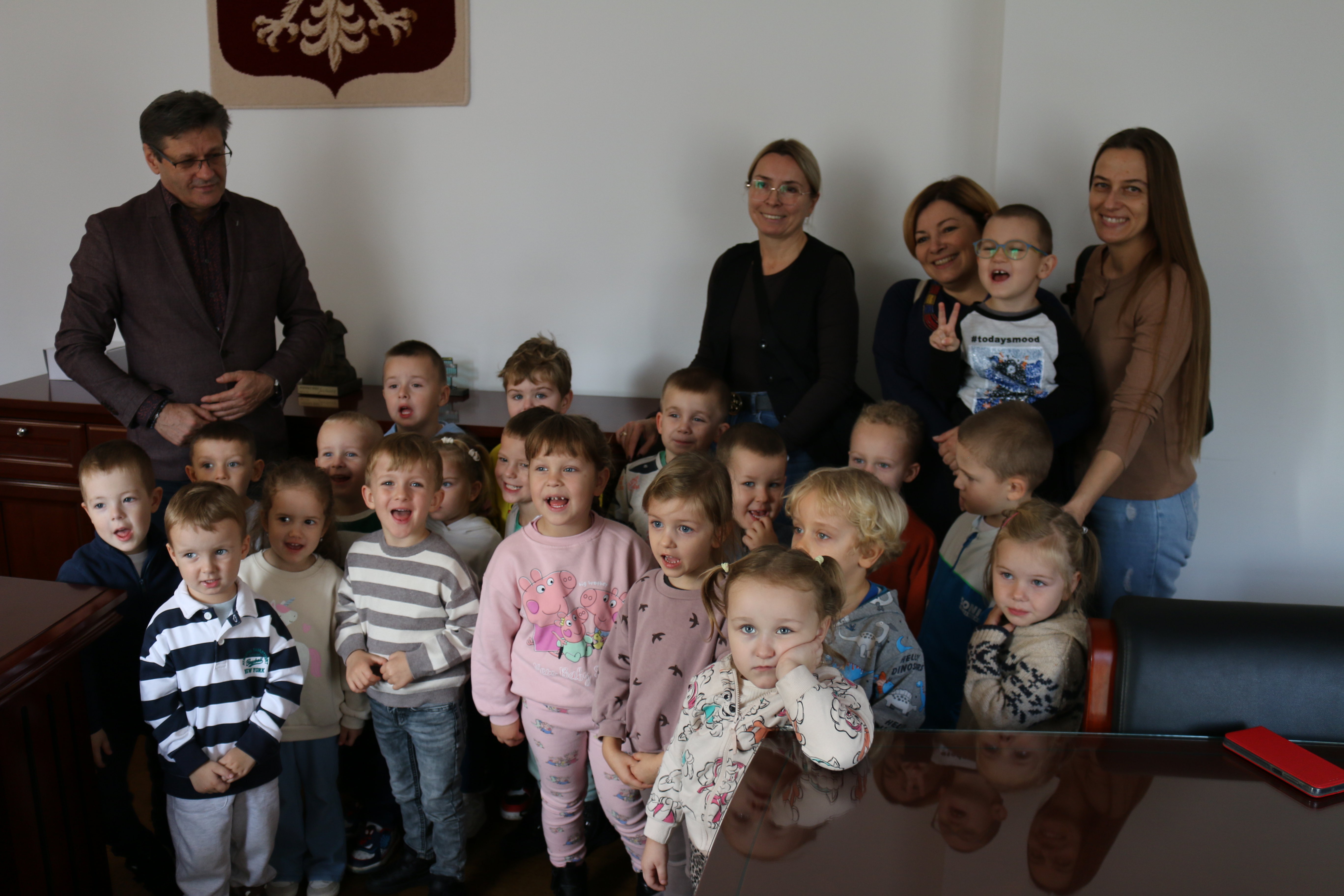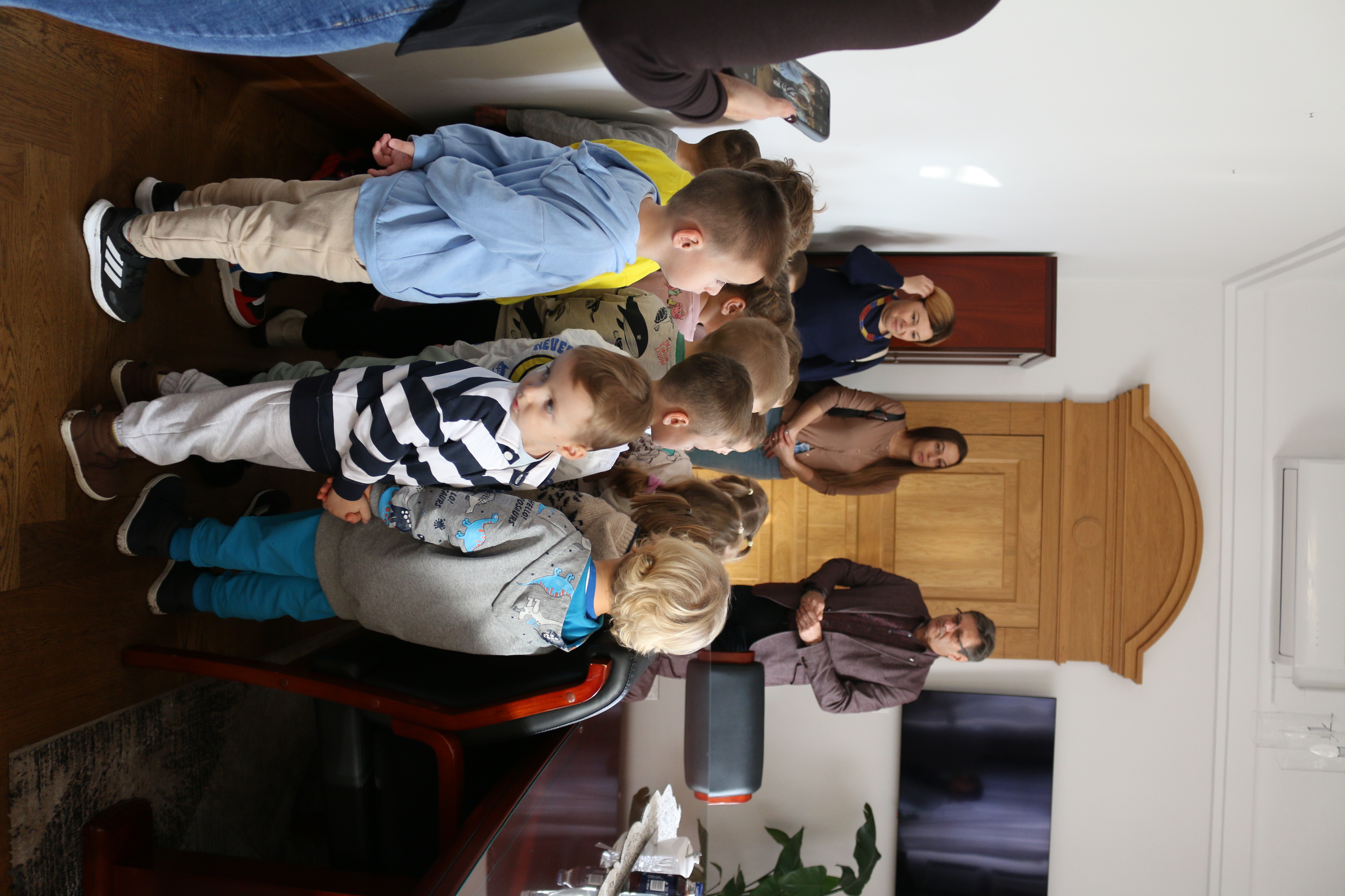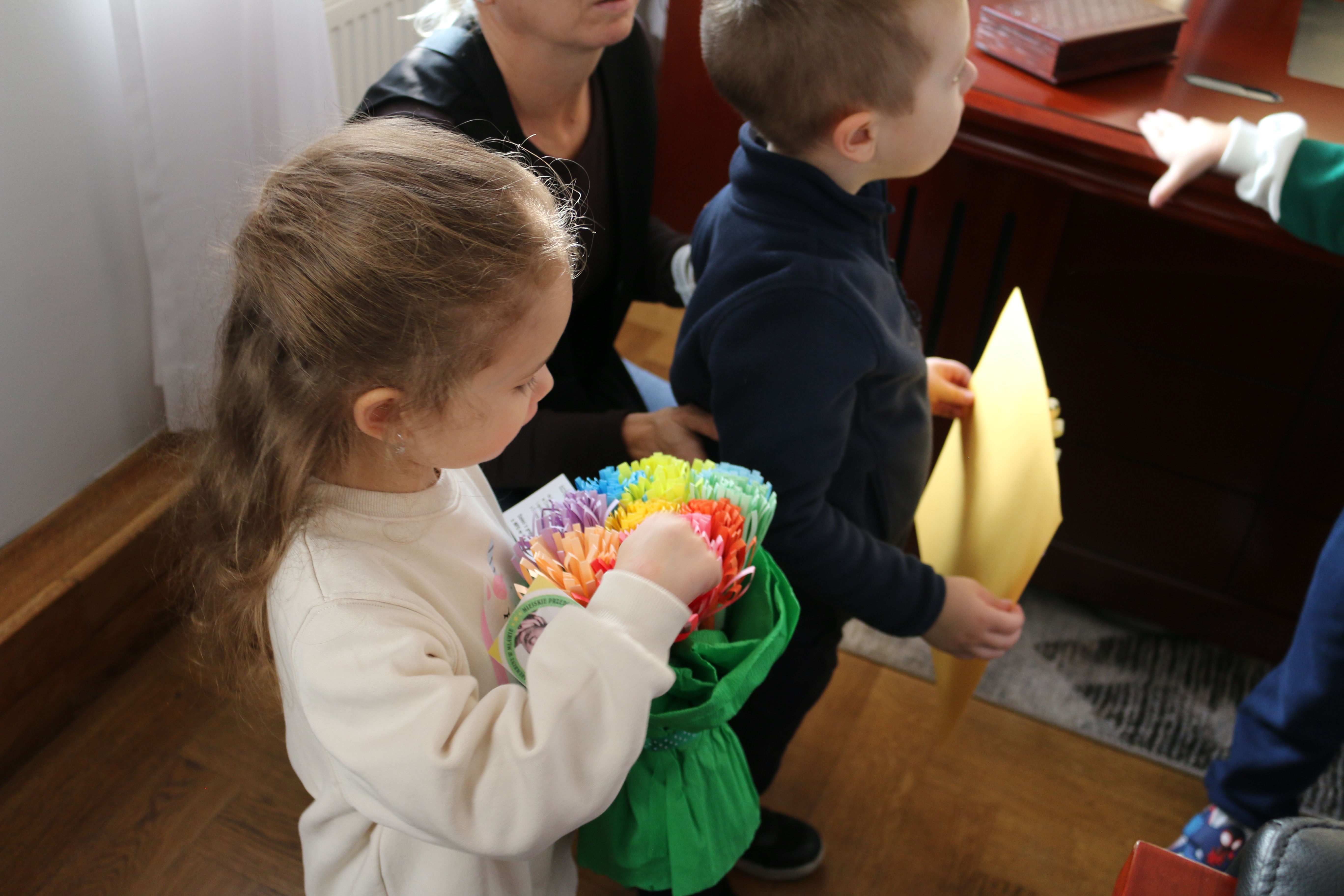 Przedszkolaki powitał Zastępca Burmistrza Miasta Mława Mariusz Szczechowicz, który z uśmiechem opowiedział im o pracy w urzędzie. Mali goście otrzymali w prezencie zestawy kredek i kolorowanek, które mają zachęcać do rozwijania wyobraźni i kreatywności. W zamian wręczyli burmistrzowi własnoręcznie wykonane z bibuły kwiatki oraz piękną laurkę, przygotowaną specjalnie na tę okazję.