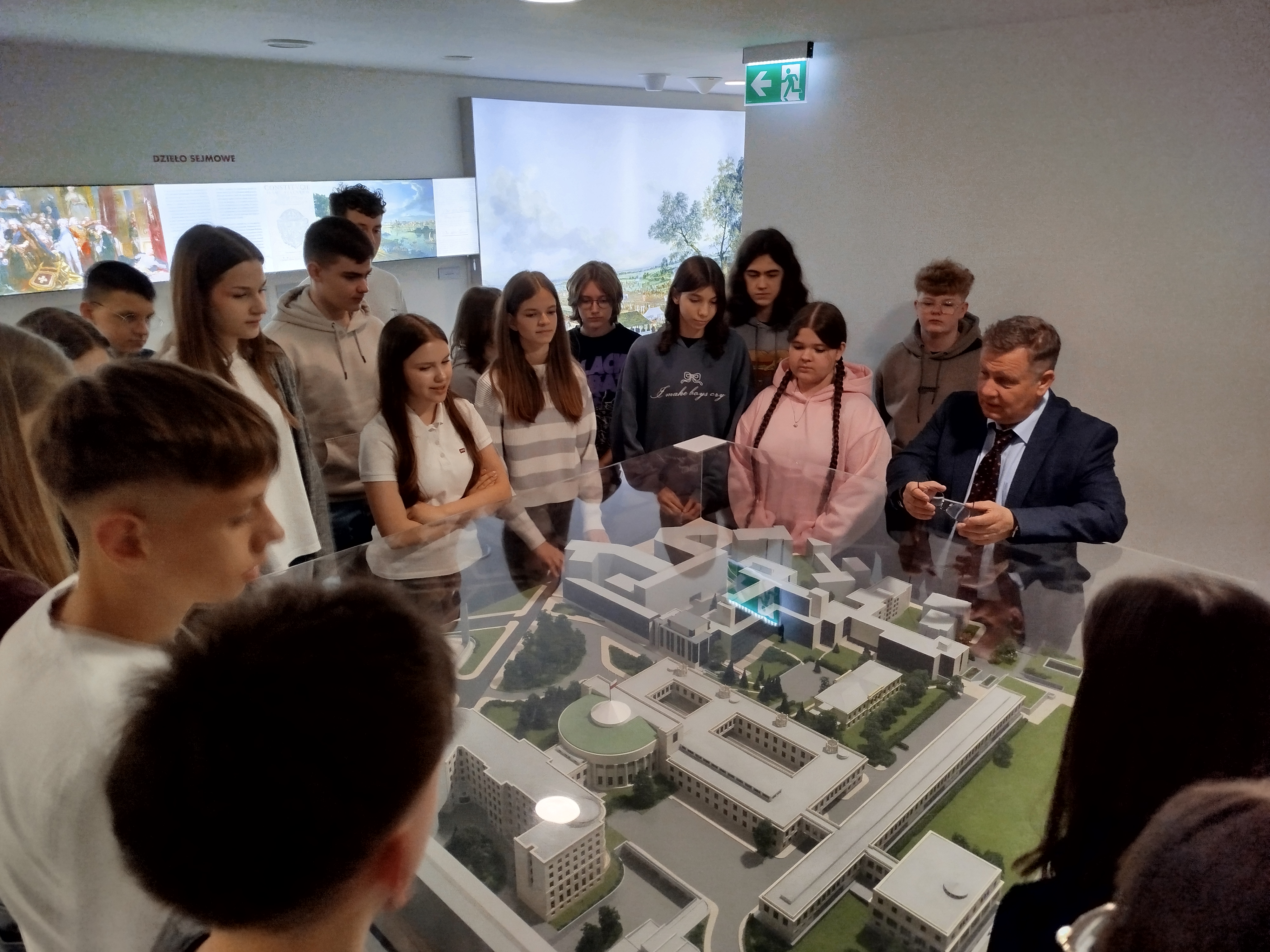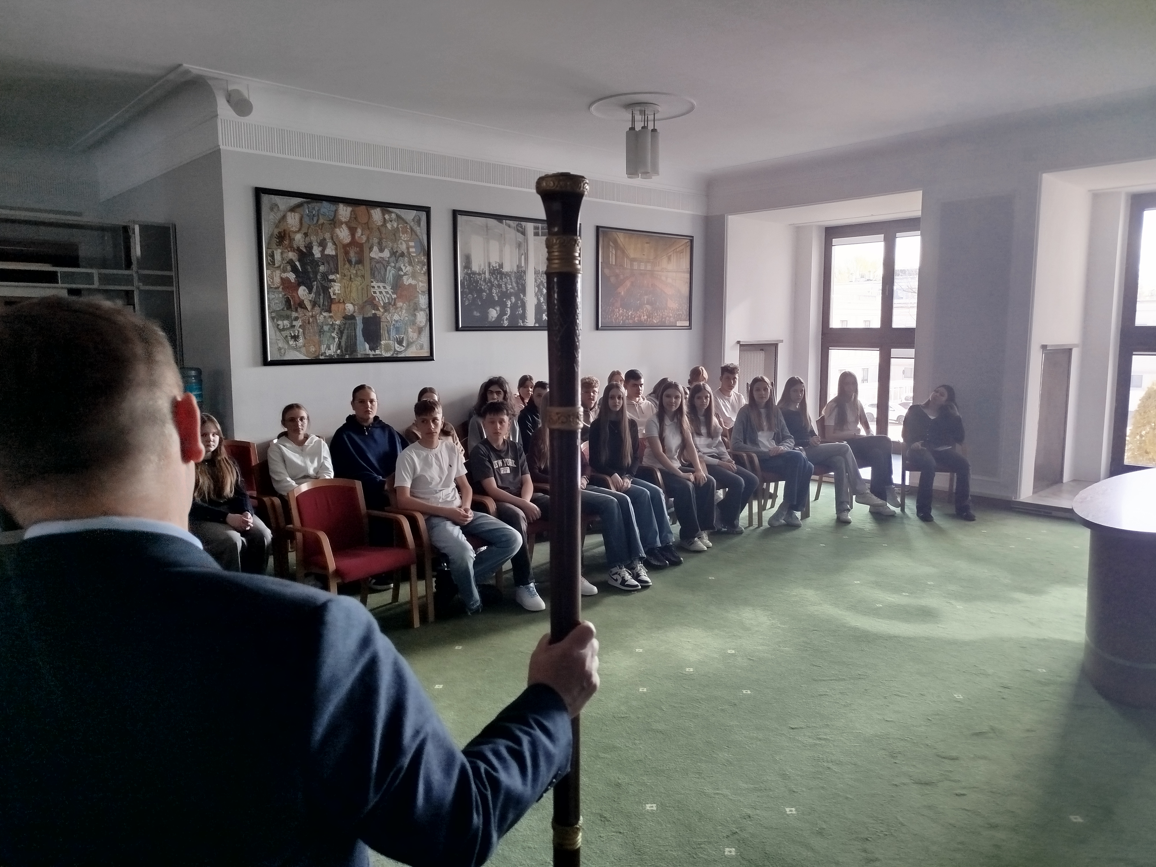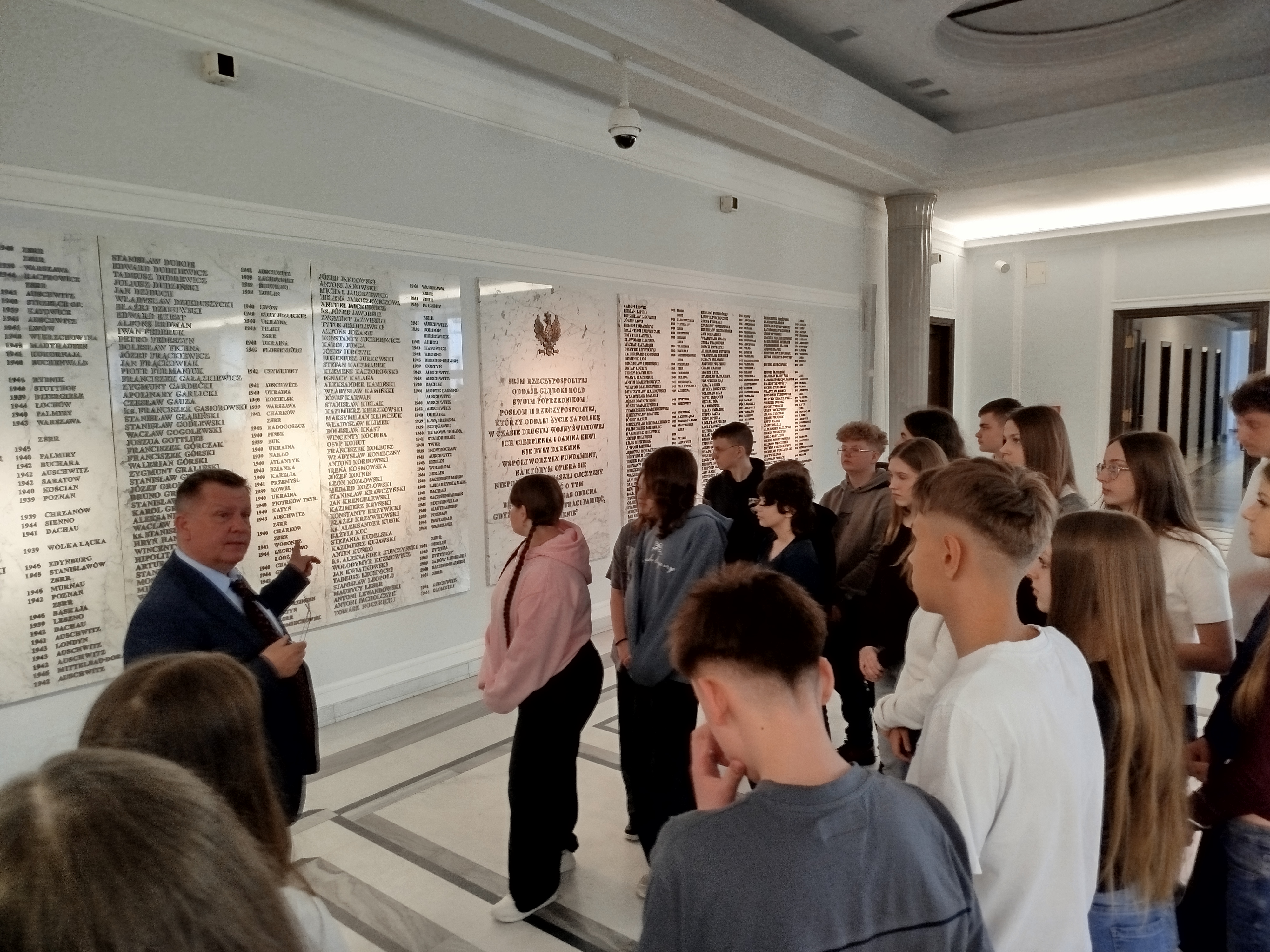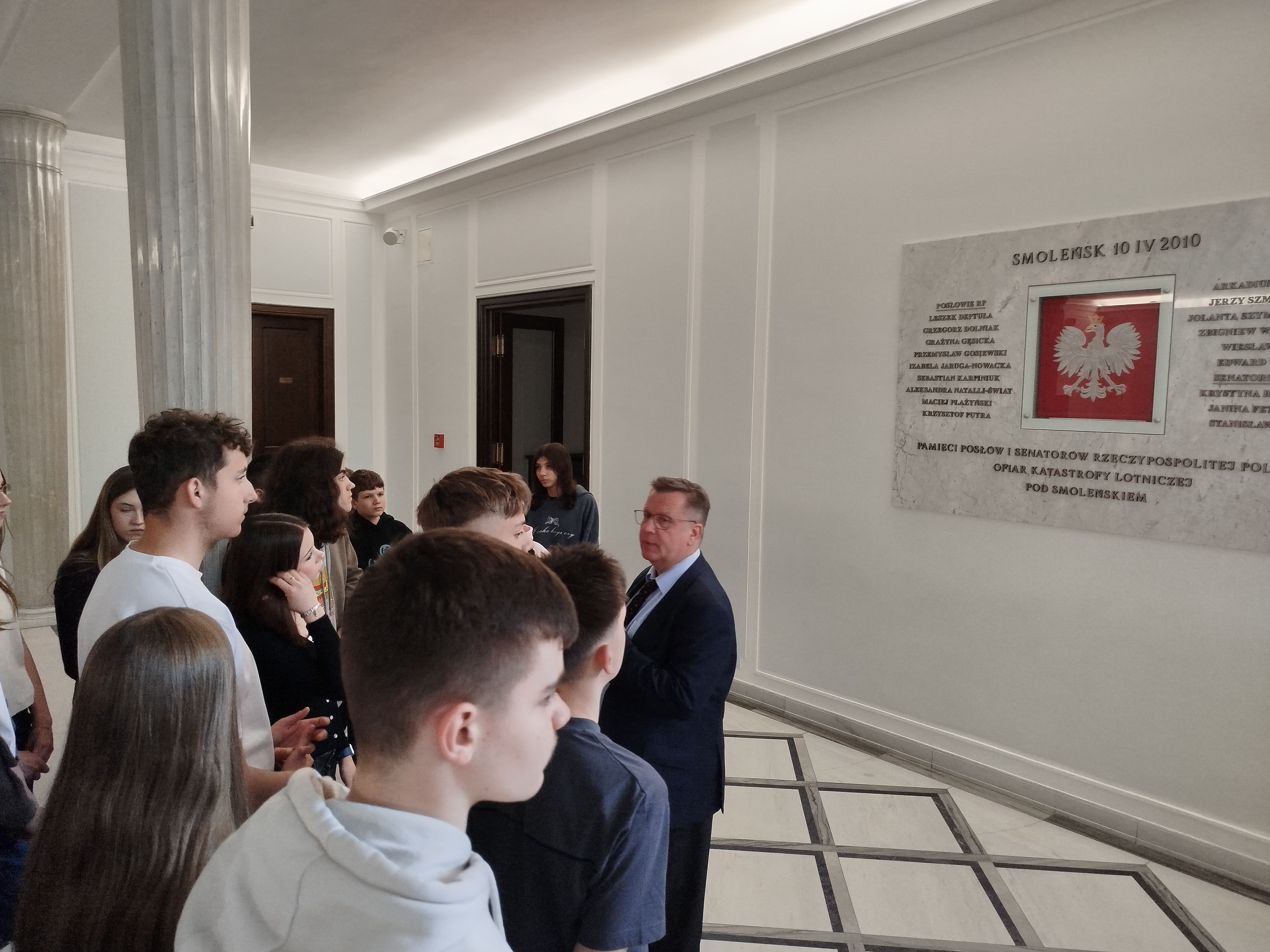 Przeszliśmy również podziemnymi korytarzami, gdzie poznaliśmy historię polskiego parlamentaryzmu, zajrzeliśmy do holu głównego – miejsca konferencji prasowych – oraz zobaczyliśmy słynne schody sejmowe, znane z wielu wydarzeń medialnych.