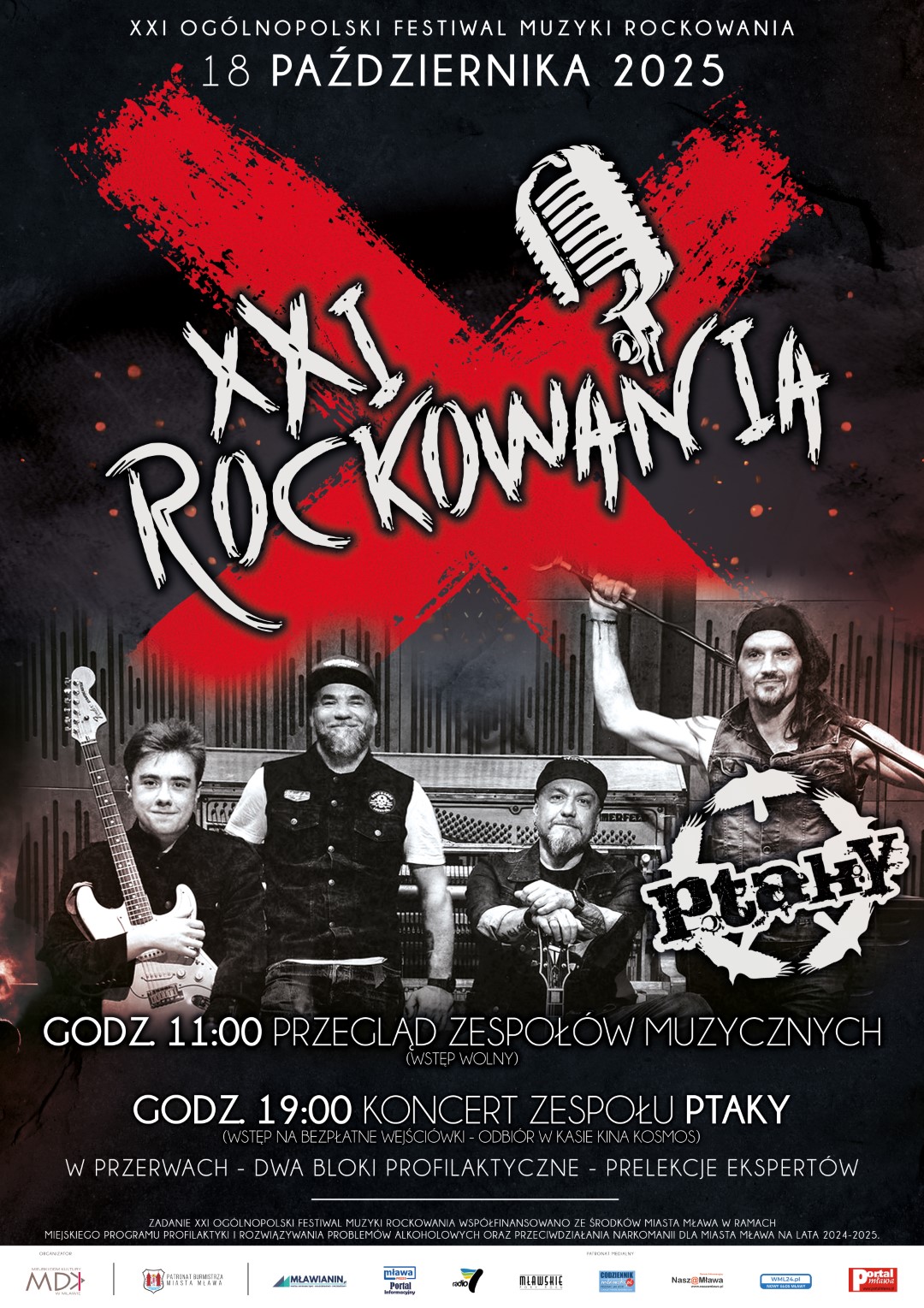 Zadanie „XXI Ogólnopolski Festiwal Muzyki ROCKOWANIA” współfinansowano ze środków Miasta Mława w ramach Miejskiego Programu Profilaktyki i Rozwiązywania Problemów Alkoholowych oraz Przeciwdziałania Narkomanii dla Miasta Mława na lata 2024-2025.