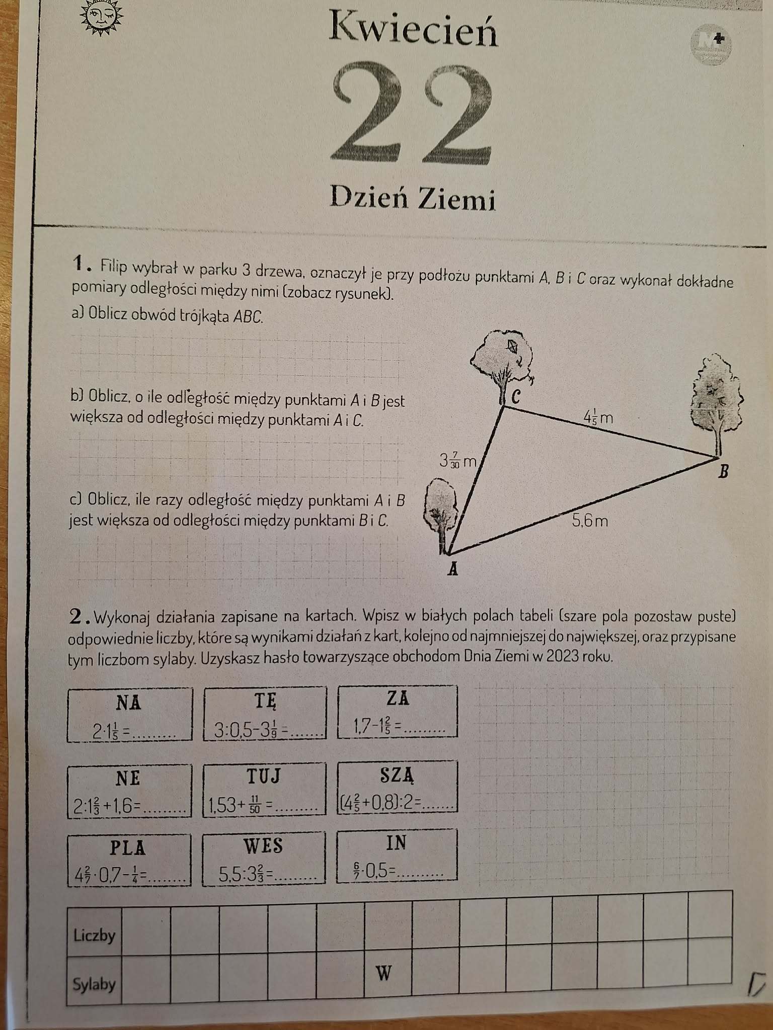 Do obchodów Dnia Ziemi włączyły się także klasy 5, które świętowały ten dzień na lekcjach matematyki. Uczniowie rozwiązywali różnorodne zadania oraz uzupełniali hasło związane z ochroną środowiska. Dzięki temu połączyli naukę z zabawą, jednocześnie pogłębiając swoją wiedzę na temat dbania o naszą planetę.